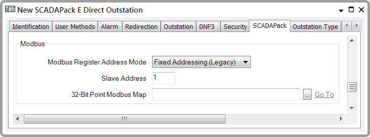 - Modbus Register Address Mode—Use this combo box to specify the type of Modbus register addressing that the SCADAPack E outstation uses. Select from: