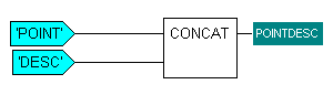 In this example, the CONCAT function has a string input of 'POINT' and a string input of 'DESC'. The function concatenates the inputs to provide an output of POINTDESC.