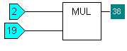 The output is the result of the top input multiplied by the bottom input. So, if the top input is 2 and the bottom input is 19, the output is 38 (2 x 19=38).