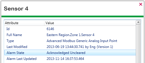 - The item’s Alarm Status changes from Unacknowledged Uncleared to Acknowledged Uncleared, as shown here in the item’s Status display.