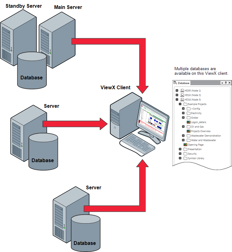 A ViewX client can be configured so that it connects to multiple Geo SCADA Expert databases (up to 64). Each of the Geo SCADA Expert databases runs on a separate Geo SCADA Expert server (or servers) and is completely independent of the other Geo SCADA Expert databases.