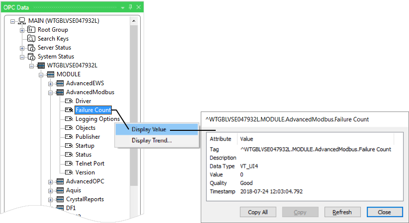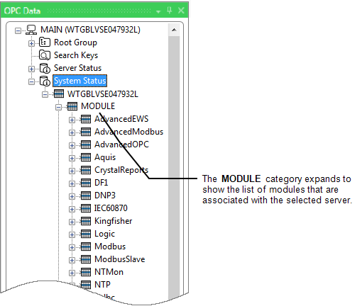 You can also use the System Status branch of the OPC Data Bar to ascertain the name of a system status property, in order to use that property elsewhere (for example, in a Logic program or on a Mimic). The name of each property is stored in the database in the form of an OPC Tag.