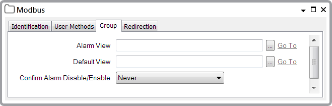 - To define an Alarm View for a Group, Group Template, or Group Instance, select the Group tab.