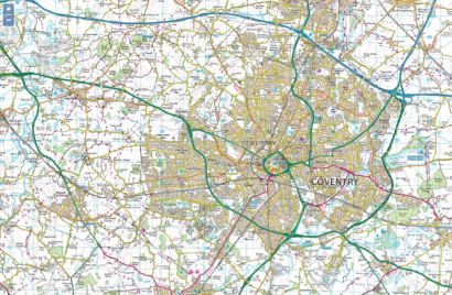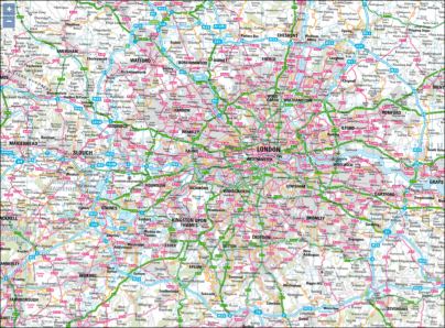 - Ordnance Survey—Ordnance Survey is the national mapping agency for the UK. The Ordnance Survey (OS) base layer provides mapping at scales of 1:50000 and 1:25000 depending on the zoom level that you set. For Ordnance Survey mapping, you must set a Default Zoom level of between 10 and 17 (see Default Zoom above). If you set a Default Zoom level of between 10 and 14, Geo SCADA Expert will display OS base layer mapping at a scale of 1:50000. If you set a Default Zoom level of between 15 and 17, Geo SCADA Expert will display OS base layer mapping at a scale of 1:25000. A typical map looks like this: