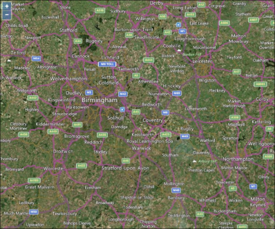 - Road—The Bing Road base layer map displays vector imagery of roads, buildings and geography: