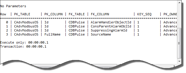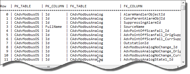 QueryPad will display Foreign Key information about every Foreign Key for the CAdvModbusOS table.