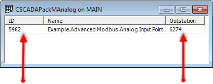 In Geo SCADA Expert, the CSCADAPackMAnalog table contains information about SCADAPack Modbus analog points. Each row represents a different point, and so the ObjectIds of the points are the Primary Key for the table. The table also contains an Outstation column. The values in the Outstation column are the unique identifiers of the outstations with which the analog points are associated.