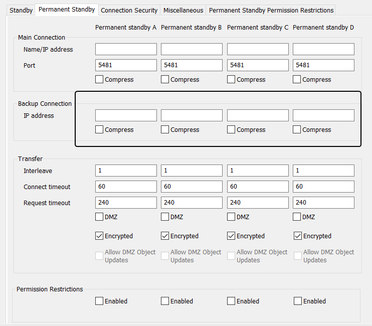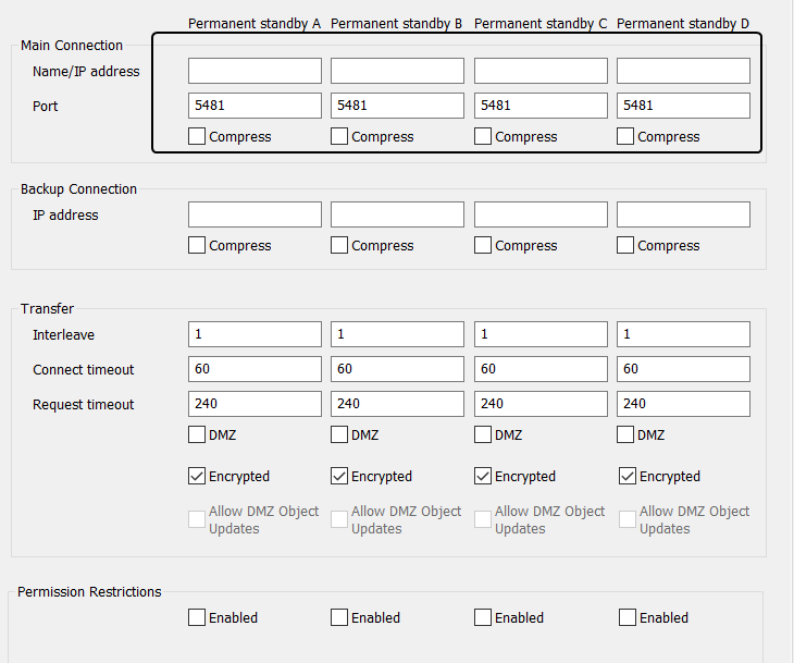 - In the Main Connection section on the Permanent Standby tab, define the primary connection between the Standby server and the Permanent Standby server. To do this, you need to use the Name/IP Address, Port, and Compress settings. There are several columns of these settings and the column you need to use depends on whether the Permanent Standby server is the first, second, third or fourth Permanent Standby server you are adding to the system architecture: