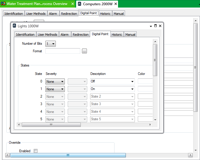 6. Double-click on the 'Lights 1000W' internal digital point to display its configuration Form. You will see that the 'Lights 1000W' Digital Point Form is displayed in front of the 'Computers 2000W' Digital Point Form in the Document Display Area with its own tab. The 'Lights 1000W' Digital Point Form is active as it is the latest Form to be displayed, but you can make the 'Computers 2000W' Form the active Form by selecting its tab.