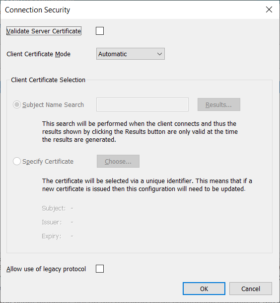 - Disabled—Not recommended. The client does not use client certificates for communications with Geo SCADA Expert servers. Select this option if none of the servers with which the client is to communicate are configured to Require Client Certificates (see Configure the Connection Security Settings in the Geo SCADA Expert Guide to Server Administration).