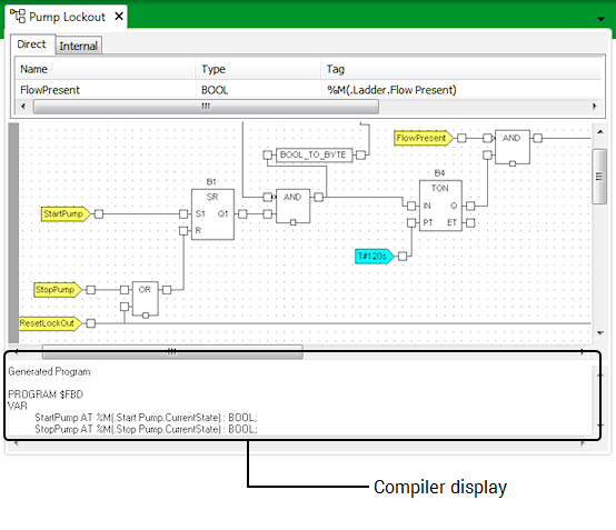 The Compile with Diagnostics tool is useful when you want to use a Function Block Diagram to form the basis of an ST program. For example, you may find it easier to create a Function Block Diagram and then use the Compile with Diagnostics tool to access the ST code for the diagram. You can then copy this code into an ST program (you have to remove the $ signs in the code).