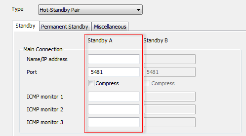 - Log on to the server that starts as Main and configure it to be part of a Hot-Standby Pair (see Configure the Partners Settings of a Server). You should set the Type to Hot-Standby Pair and use the Standby A column of fields to define the connection settings of the Standby server. For example, in the diagram below, you would set the Name/IP Address, Port, compression settings (Compress), and ICMP Monitors for the Main Connection between the Main server and the Standby server by using the fields in the Standby A column.