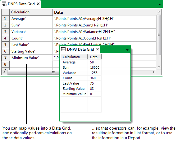You can then, if required, use the Data Grid’s table in a Report (see the Geo SCADA Expert Guide to Crystal Reports), or display the data in List format (see Display the Data on a Data Grid, Data Set, or Data Table in List Format in the Geo SCADA Expert Guide to Lists).