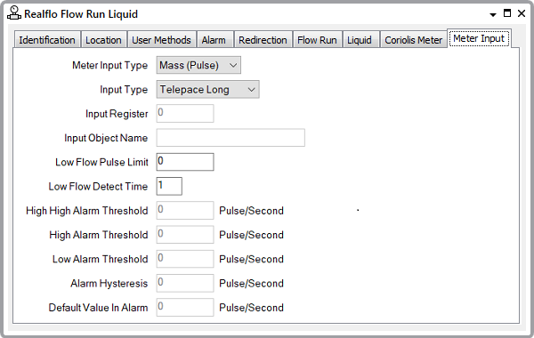 The Meter Input tab fields vary depending on the Meter Input Type that you select. This sections describes the fields related to either the Mass (Pulse) or Volume (Pulse) Meter Input Type. (The latter type of meter input only applies to Liquid and Water Flow Runs.)