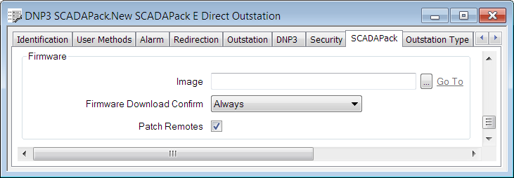 Use the fields within the Firmware section of the SCADAPack tab to define the properties associated with downloading operating system firmware to the outstation. In order to configure these Firmware properties successfully, a suitable DNP3 SCADAPack Firmware Image item has to exist in the Geo SCADA Expert database (see Configure a DNP3 SCADAPack Firmware Image Item).
