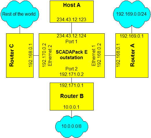 This example illustrates the four types of IP Route that a SCADAPack E outstation can support.