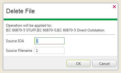 - Source Filename—Specify the number of the file that Geo SCADA Expert is to delete from the above IOA on the outstation. The filename is a 2 octet number, in the range 0 to 65535.