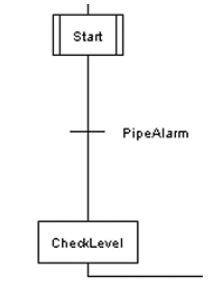 The Start step is the initial step. The second step is CheckLevel. The CheckLevel step only becomes active if the condition defined by the PipeAlarm transition is true. When the CheckLevel step is active, the Start step becomes inactive.