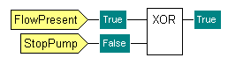 An XOR function has 2 inputs - Input 1 is from a flow sensor and is named 'FlowPresent' and Input 2 is from a Pump control and is named 'StopPump'. When the function receives a True input from 'FlowPresent' and a False input from 'StopPump' it outputs a True value (as it has different input values). Similarly, when it receives a False value from 'FlowPresent' and a True value from 'StopPump' it outputs a True value.