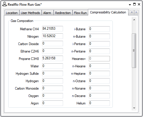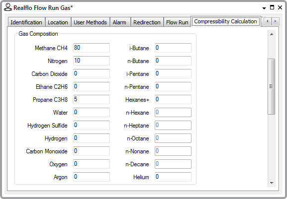 The fields within this section of the Compressibility Calculation tab display those properties that are associated with Gas Composition. The properties display the amount of each component that combines to form the overall composition of the gas that the Flow Run is measuring.