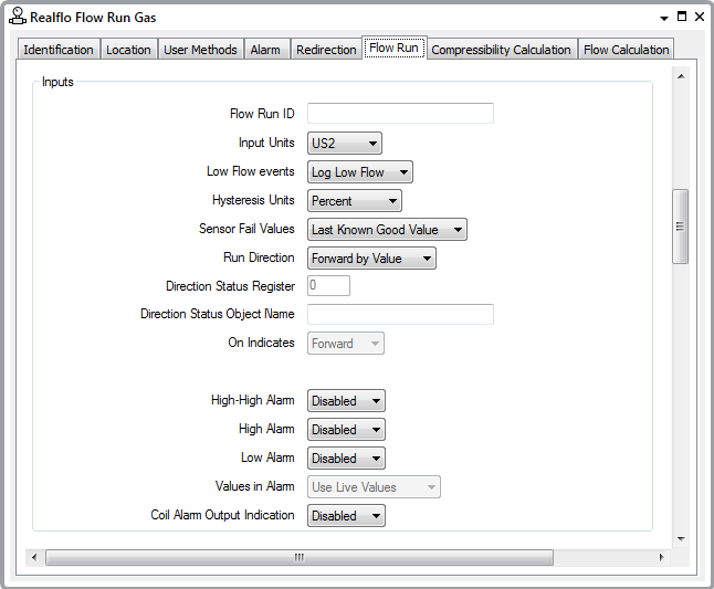 The Inputs section of the Flow Run tab is common to all of the flow run types. You can configure these properties directly in Geo SCADA Expert, or read the configuration into the Geo SCADA Expert database (see Configure or Read the Flow Run Configuration).