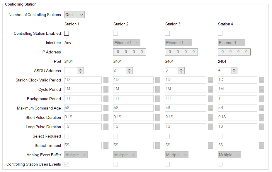 - Controlling Station—Use the fields within the Controlling Station section to define how the SCADAPack x70 device's IEC 60870-5-104 Controlled Station reports data to its controlling station(s).