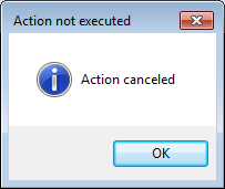 If the user selects the Close window button (at the top corner of the Form) or presses the Esc key, the action is canceled. A dialog box is displayed containing the message "Action canceled", and it has the title "Action not executed". There is no dialog box message if the user selects the Cancel button.