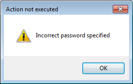 If the incorrect password has been entered, a dialog box is displayed containing the message "Incorrect password specified". The title of the dialog box is "Action not executed".