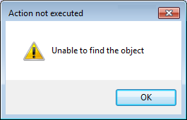 If the correct password is entered, but Geo SCADA Expert cannot locate the database item, a dialog box is displayed. The dialog box contains the message "Unable to find the object". The title of the dialog box is "Action not executed".