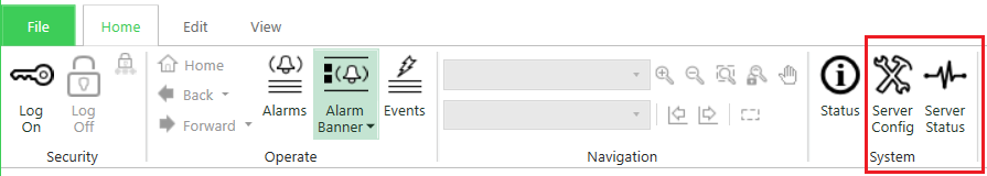 We have added further commands to the 'System' command group on the Home tab of the ViewX ribbon. The additional commands provide an alternative means of accessing the Server Configuration Tool and the Server Status Tool.