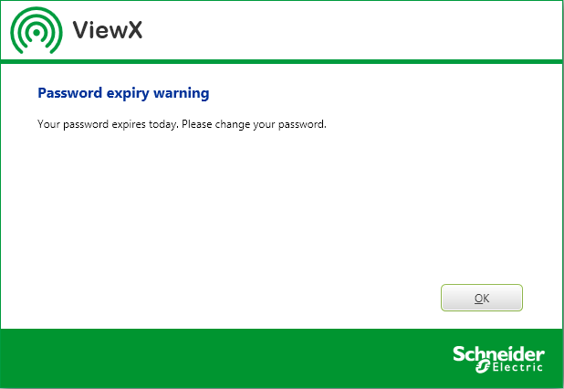 Password Expiration WarningIf the Password Expire After n Days option is enabled you should enter the default number of days that a user is informed in advance that their password is due to expire. Once this limit is reached or in the last 24 hours before the password expires, ClearSCADA displays the a password expiry warning whenever the user logs on.
