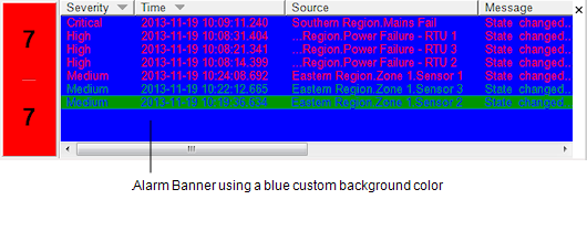 You can use the Option window’s Alarms and Events tab to define a custom background color for the Alarms List and Alarm Banner. The color that you choose will be shown behind the text for each alarm entry, but only for alarms that are not affected by the Background Colors for the severity range. You can choose background colors for each severity in the Server Configuration Tool’s Severity settings (see Define the Background Colors for a Severity in the ClearSCADA Guide to Server Administration).