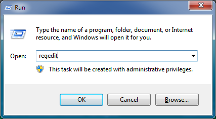 - Enter the following text in the Open field and select OK to run the registry editor: