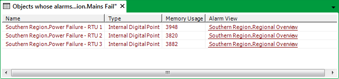 The ‘Mains Fail’ item’s Suppressed Alarm Objects pick action is used to display a list of the child database items that might have suppressed alarms due to the ‘Mains Fail’ alarm being active: