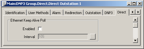 Use the fields within the Ethernet Keep Alive Poll section of the Direct tab to configure if, and how often, ClearSCADA sends a periodic DNP3 Request Status of Link frame to the outstation. This transmission is designed to stop an Ethernet TCP/IP link from being disconnected by the ClearSCADA server’s operating system, or the outstation, due to long periods of inactivity.