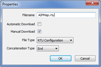 Use the Properties button on the Configuration Setup Window to edit the properties of a file in the SCADAPack E outstation’s configuration. The Properties window is also displayed when you add a file to the DNP3 SCADAPack E outstation’s configurations (see Add a File to a SCADAPack E Outstation’s Configuration).