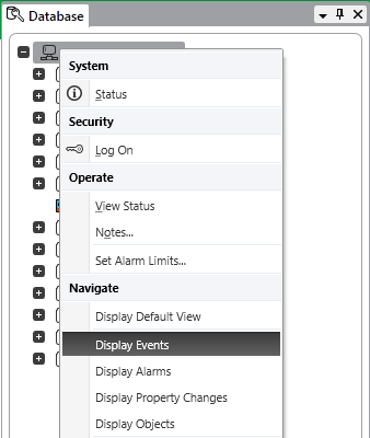On a ViewX client that has access to multiple ClearSCADA databases, the above procedures each display the general Events List for the default ClearSCADA database. To display the Events List for a particular ClearSCADA database to which a ViewX client has access:
