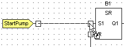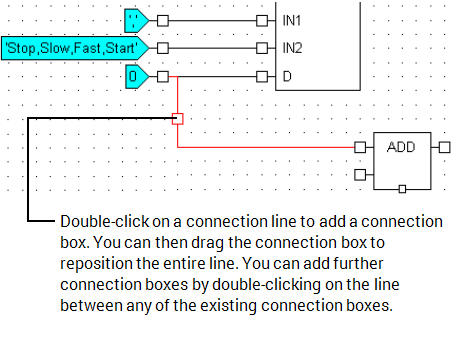 If the connection lines on your Function Block Diagram are cluttered and overlap, you can reposition them manually. To do this, simply double-click on the line you want to reposition. This will cause a new connection box to appear on the line. You can then drag the selection box to a different, more appropriate position as required.