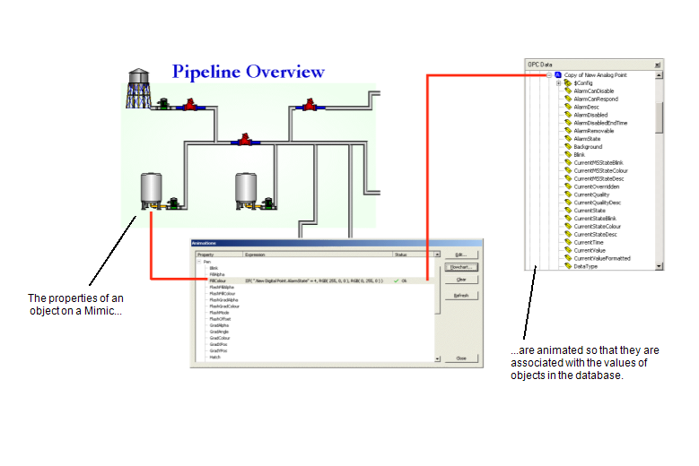 Each Mimic object has properties that you can associate with values in the database. For example, you can associate the size of a Mimic object with the value of an analog point so that the Mimic object is larger when the point has a high value.