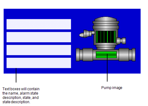 The following faceplate symbol is created to act as a generic display for Pumps. It is to contain the name of a pump, its state, alarm state description, and state description.