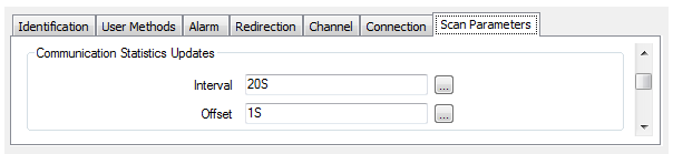 On channels on which non-continuous polling is used, use the fields within the Communication Statistics Updates section of the Scan Parameters tab to specify when the communications statistics are updated for the channel.