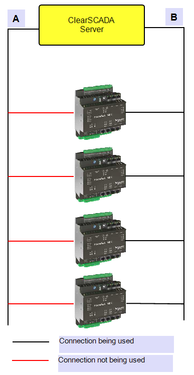 ClearSCADA communicates with the outstations via the direct channel that is configured as Line B.