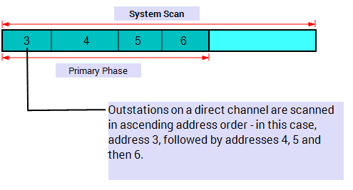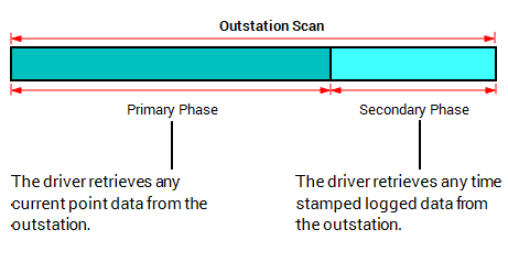 The actual scanning process varies, depending on the protocol. With direct outstations on many advanced drivers, scanning is typically achieved using two scan phases. With many advanced drivers, the driver typically scans each of the outstations on a channel for current data (the Primary Phase of the scan). When each of the outstations have been scanned, the driver then typically scans the outstations again, this time for secondary (logged) data (the Secondary Phase of the scan).