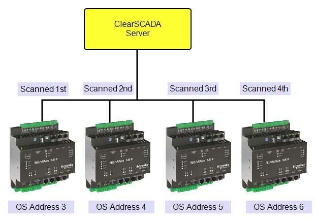 This example illustrates a typical system where the outstations are not independent. A driver scans four outstations that are using a direct channel to communicate with the server. It scans the outstations in ascending address order, starting with the lowest address (in this case, Address 3).