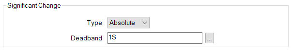 - Absolute—In addition to the reasons listed in ‘None’ above, the point value will be updated in the ClearSCADA database if it changes by a defined amount.