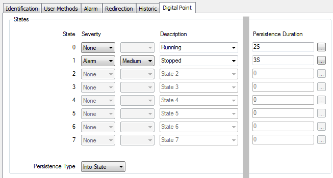 As such, when the point changes from ‘Running’ to ‘Stopped’, three seconds has to elapse before the value and state are recorded as having changed (as the point’s Persistence Type is configured as ‘Into State’, with a Persistence Duration of 3S (3 seconds) for the ‘Stopped’ state). If, during this three-second period, the value changes back, the fleeting change in value and state are not logged.