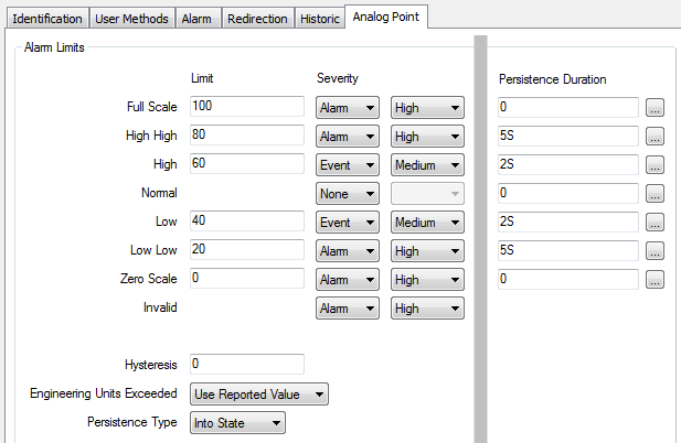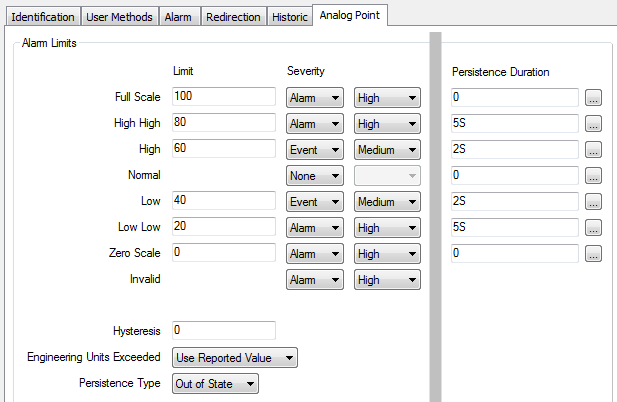 If, during the two-second period, the point’s value did not rise, but instead it continued to fall, if it dropped below 20 (the Low Low limit), the persistence timer would restart. A period of 5 seconds would then have to elapse before the point value and state (Low Low) were deemed to have changed and are recorded. This is because the Persistence Duration for the point going into the Low Low state is specified as 5S (5 seconds).