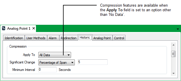 - All Data—ClearSCADA compresses all of the data that it stores historically for this point, with the exception of any Point Updates to which Compression Settings do not Apply.