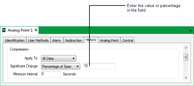 - Percentage of Span—The value of the point has to change by a defined percentage of the span if it is to be stored historically. The span is the point's full range of values and is defined in the Alarm Limits section of the point's form. The labels used on point forms for the range fields vary between drivers. For example, Zero Scale to Full Scale or Underrange to Overrange.