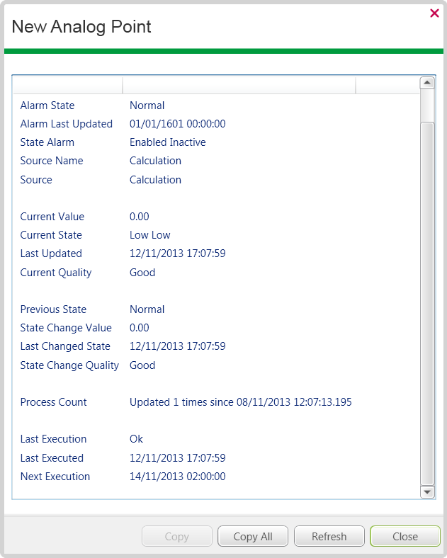 For example, the Status display for a Calculation Point provides information about the present state of the point.